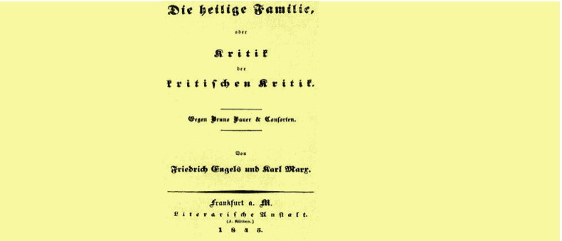 Marx ve Engels’in ilk ortak eserleri 1845’de kaleme aldıkları, Kutsal Aile ya da Eleştirel Eleştirinin Eleştirisi’dir. Büyük kısmını Marx’ın yazdığı Kutsal Aile, Marx ve Engels’in gerçek bir işbirliği sonucu gün yüzüne çıkmıştır. Allegemeine Literatur-Zeitung çevresinde toplanan Bauer kardeşler (Edgar ve Bruno Bauer) ile onların Genç Hegelci arkadaşlarını gülünç bir adlandırma biçimi olan Kutsal Aile’de sözü geçen bu kesimin idealist düşüncesini çürütürlerken, yeni yeni şekillenmeye başlayan tarihsel materyalizme daha sağlam dayanaklar yaratan ideolojik görüşler ortaya çıkmaya başlar. Marx’ın 1845’de formüle ettiği Feuerbach Üzerine Tezler’den sonra 1846’da Engels ile birlikte yazdıkları Alman İdeolojisi’nin sayfalarında ise Marksizm’in temel kavramlarının gün yüzüne çıkmaya başladığını görmekteyiz.